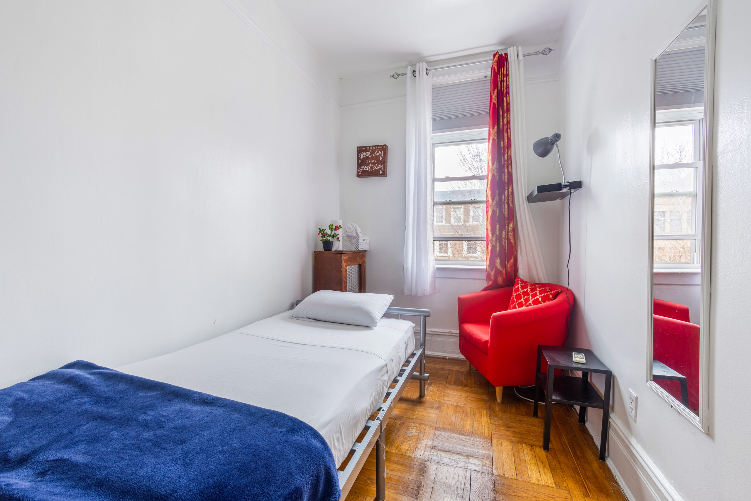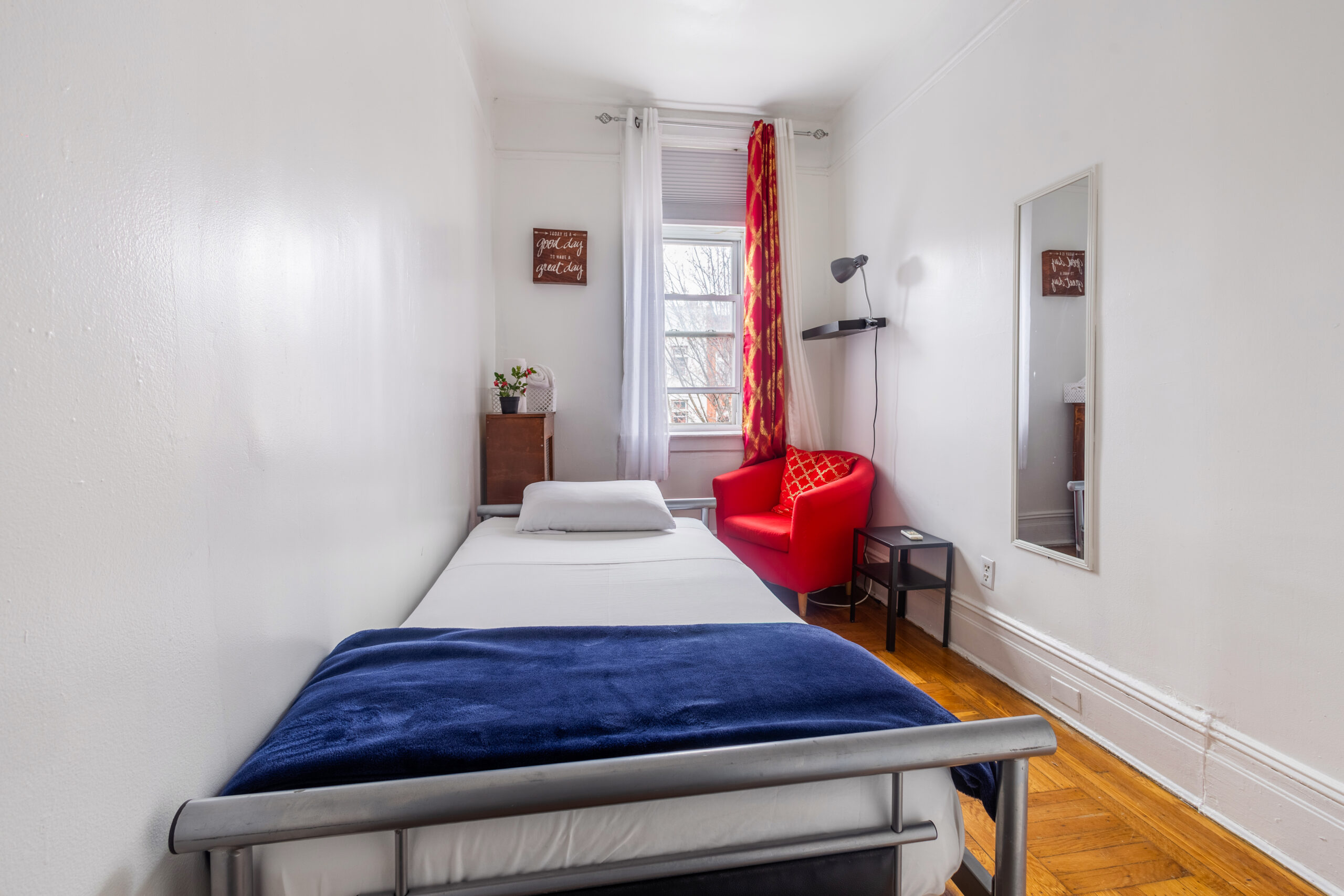 Discover a small single bed room with a private bathroom in the hallway dedicated to this room only. The room is equipped with an AC, an armchair and a closet.