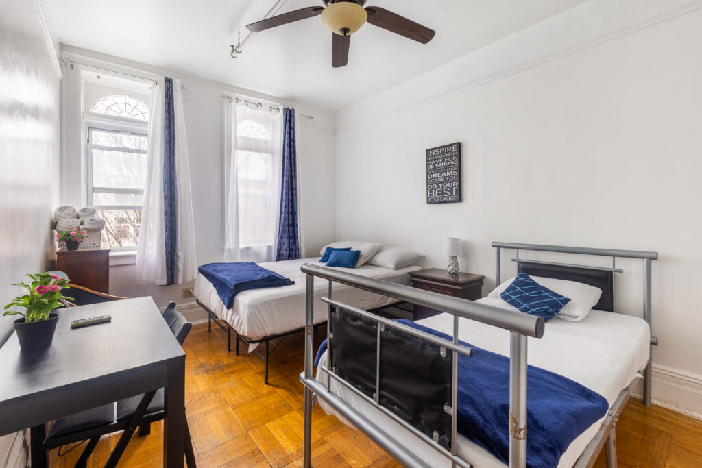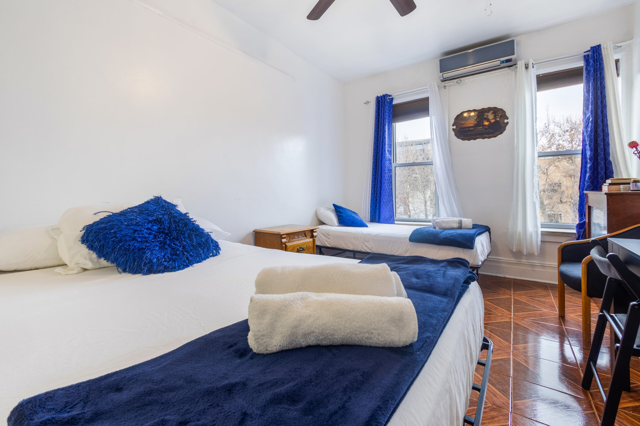 Discover a spacious room offering one queen size and one twin size bed, a table, and three chairs. Enjoy the abundance of natural sunlight streaming in through the generous window, creating a bright and inviting ambiance.